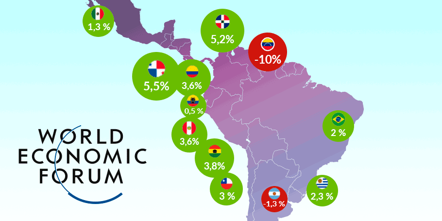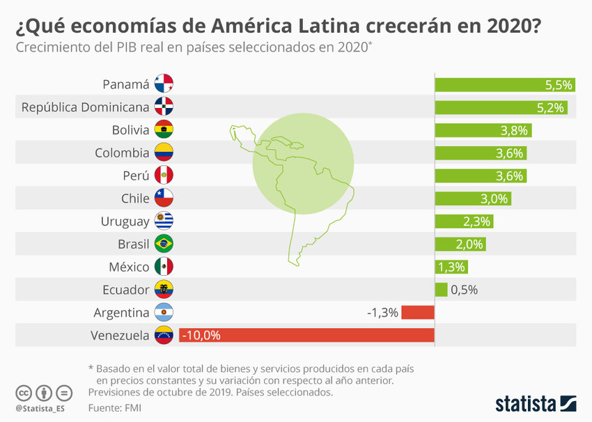 World Economic Forum junto a Statista realizaron un análisis sobre la situación económica que tendrán los países de América Latina en el 2020, basado en el valor total de bienes y servicios producidos en cada país en precios constantes y su variación con respecto al año anterior (previsiones de octubre de 2019). Estos fueron los resultados: