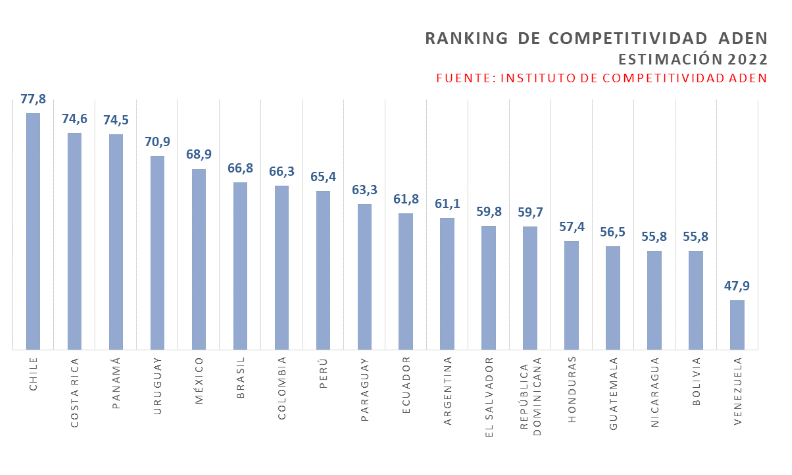 En su edición 2022, Chile y Costa Rica se destacan en los primeros puestos a nivel competitividad mientras que Bolivia y Venezuela se encuentran al final de la lista.