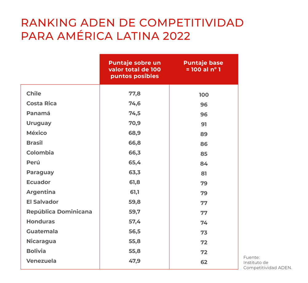 En su edición 2022, Chile y Costa Rica se destacan en los primeros puestos mientras que Bolivia y Venezuela se posicionan como los países menos competitivos de la región.