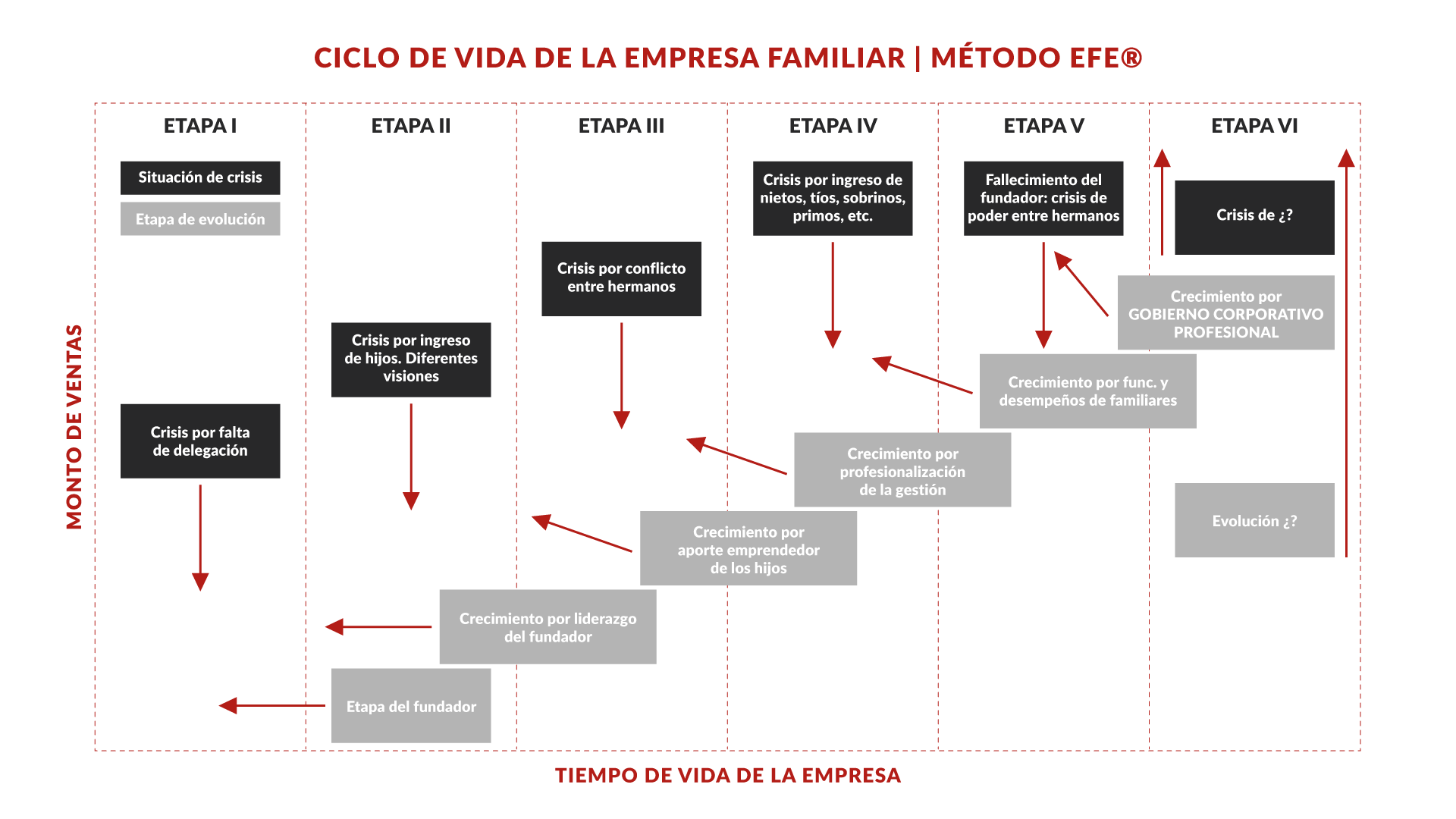 El método EFE parte de un modelo de ciclo de vida de la empresa familiar que se adapta a las empresas de hasta la tercera generación. El modelo muestra las etapas de vida de las empresas familiares con sus correspondientes crisis más comunes en cada una de ellas.